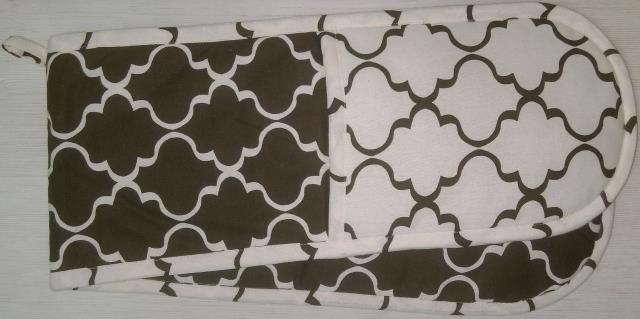 An oven glove, or oven mitt, is an insulated glove or mitten usually worn in the kitchen to easily protect the wearer's hand from hot objects such as ovens, stoves, cookware, etc. Fabric gloves consist of heat insulation surrounded by cotton fabric, usually consisting of decorative patterns. Newer oven gloves are often treated with silicone, which makes them resistant to water and stains, or made of stronger synthetic materials such as Kevlar or Nomex. Oven mitts are often sold singly rather than in a pair, designed to be worn on either hand.